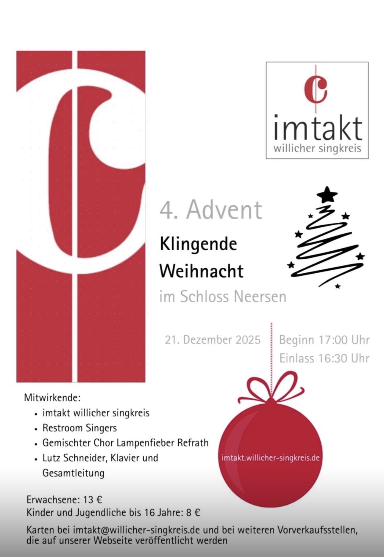 Allerdings werden wir am 21.12.2025 um 17:00 Uhr am Adventskonzert des Willicher Singkreises imtakt als musikalische Gäste teilnehmen. Das Konzert (Einlass: 16:30 Uhr) findet im Schloss Neersen statt. Karten zum Preis von 13 € (Kinder und Jugendliche unter 16 Jahren 8 €) sind unter imtakt@willicher-singkreis.de oder an den örtlichen Vorverkaufsstellen erhältlich.